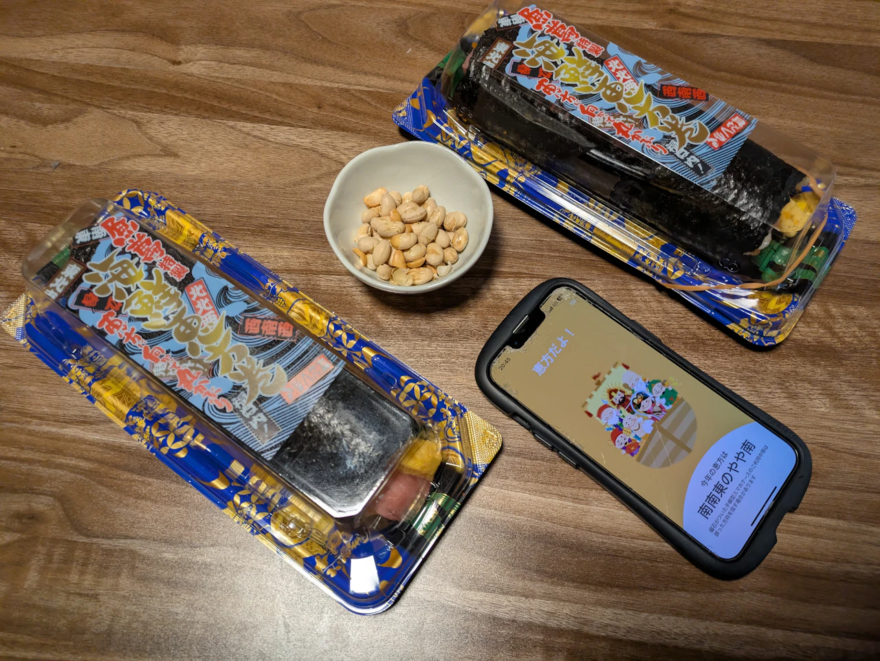 恵方の方角を調べるアプリを使いその方向を向きながら、一口目までは無言で食べます。