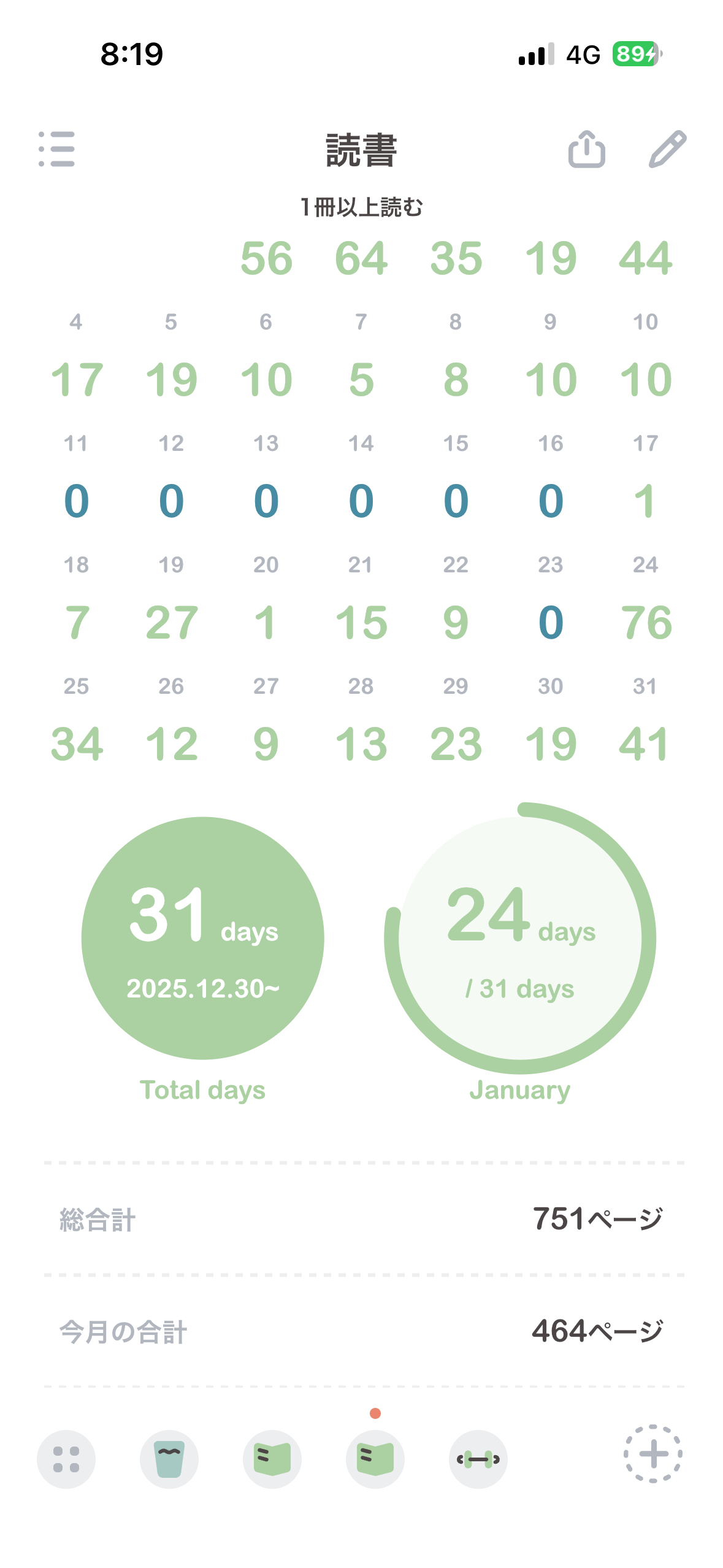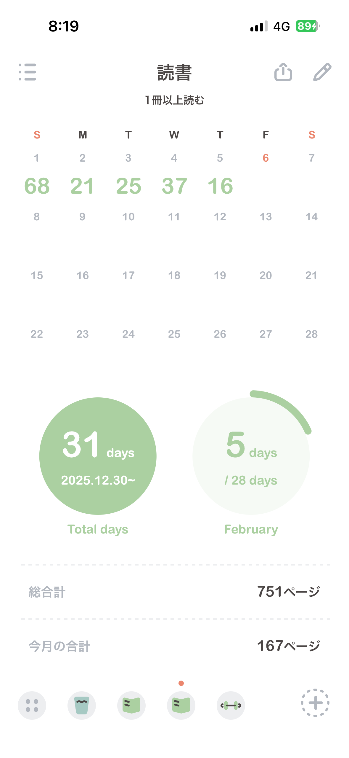 ちなみに読んだ1日に読んだページ数は記録していて、1月と2月の進捗はこんな感じです。
